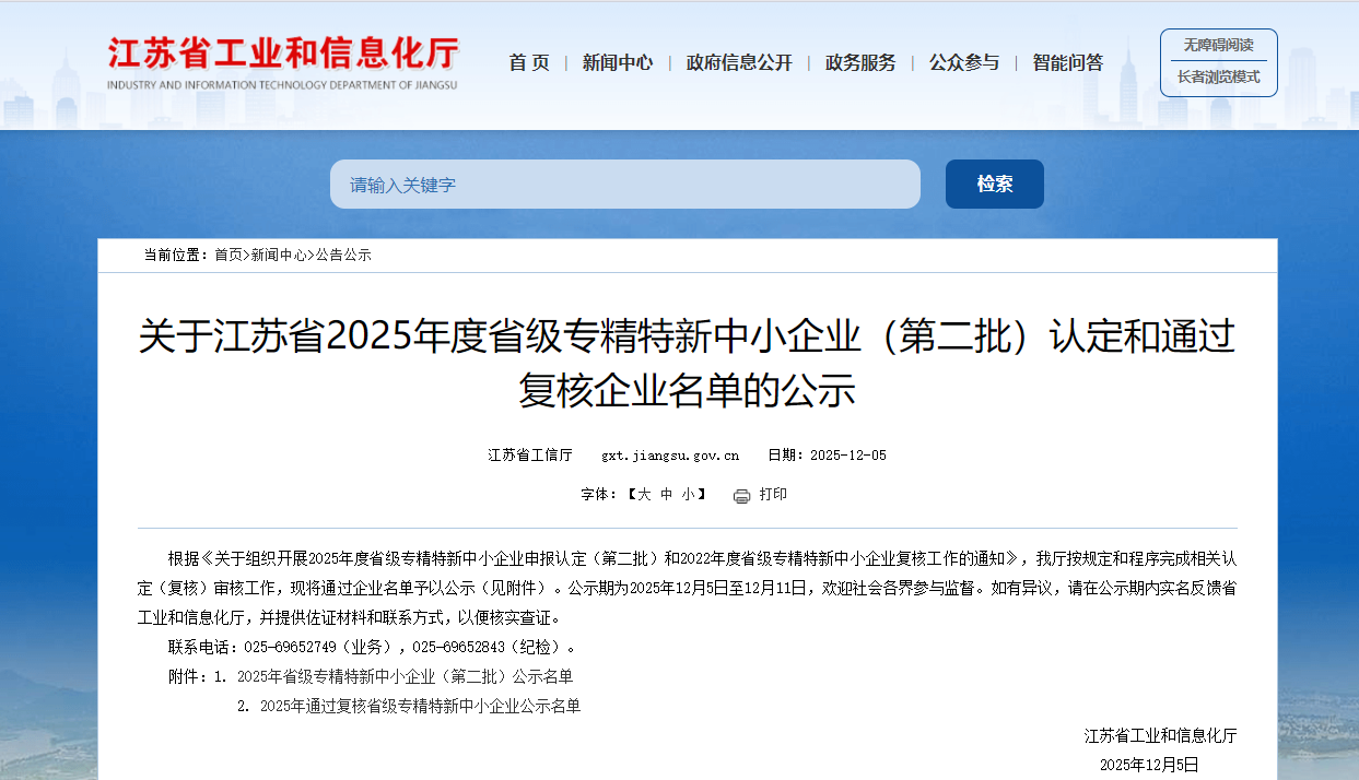 近日,江苏省2025年度省级“专精特新”中小企业名单正式发布。